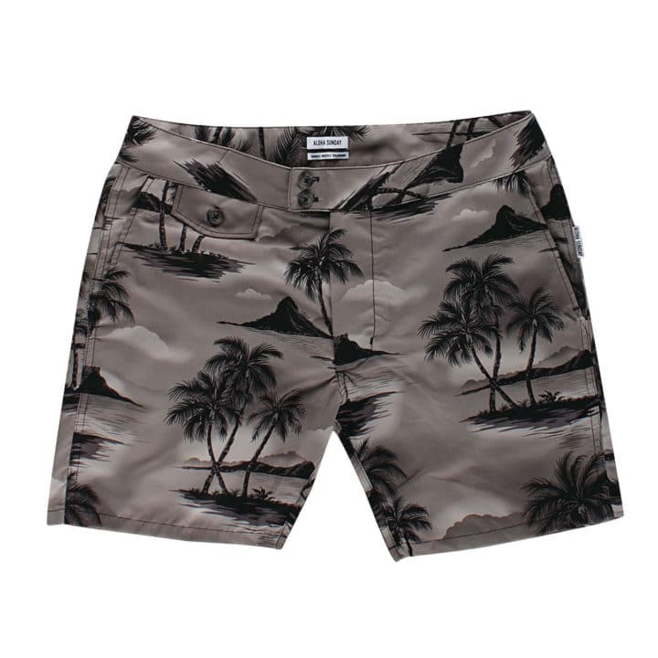 Aloha Sunday surf inspired swim trunks and board shorts are cut and sewn in the USA from materials sourced domestically and worldwide. Aloha Sunday swimsuits are tailored cut and are slim fitting. Sizes range from 28 to 36.