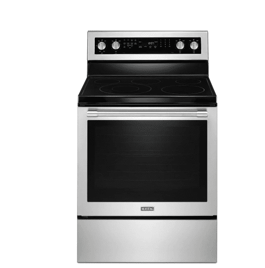 This electric stove with True Convection is available in fingertip resistant stainless steel. It is designed, engineered and assembled in the USA and is Top Rated at Home Depot.